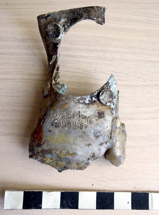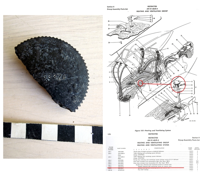 Díl z podpůrné konstrukce přístrojové desky, v kroužku vpravo značka výrobce letadla (NAA - North American Aviation, Inc.)